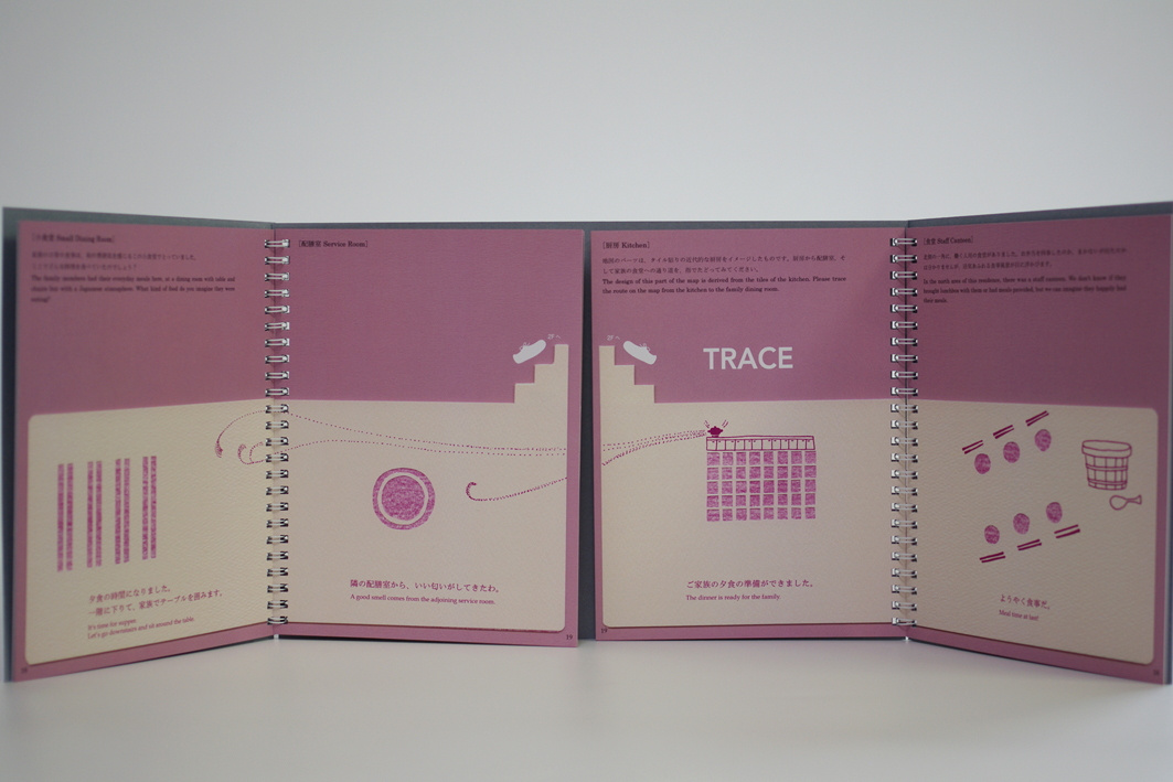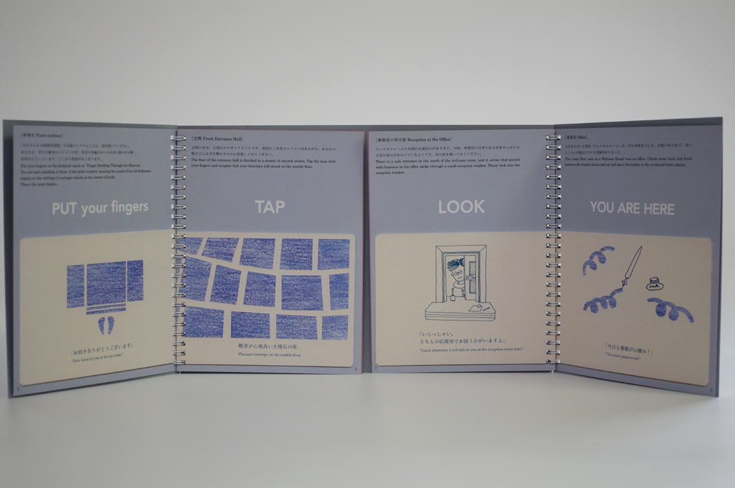 It is a picture book for ‘Finger strolling through the museum’ at Teien Art Museum, Tokyo. The book tells two stories which could have been happen in this house from 3 points of views (guest, family and staff). It is designed for museum visitors to start to imagine their own stories about this architecture.
