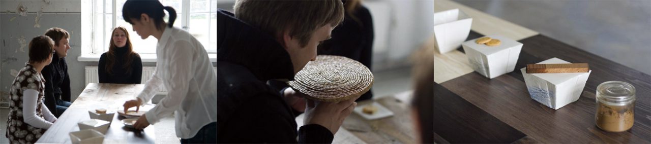 3人の参加者のいえの空間の記憶を、味覚、聴覚、臭覚を切り口に共有するお茶会をデザイン。これまでにフィンランドで制作してきた美術館でのインスタレーションやワークショップのあり方を思索することを目的とした修士制作。 空間は、フィンランドの森にあった小屋の材をはじまりとして、新しい材との組み合わせや、複製の手法を使って、現代の生活にも適応するものとしてデザインしたテーブル・スツール・ベンチ・器によって構成した。