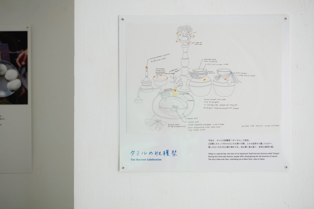 Exhibition of Japanese edition of ‘ Travels Through South Indian Kitchens’. Design the exhibion so that people encounter this book with their sense of body and 5 senses. 1 to 1 scale drawing of the door to ‘Kitchen in Memory’, spices from the recipe from ‘ A Taste of Home’, kitchen tools are exhibited with quotation of photos and texts. Tara Books made 3 video clips of this book and released at this exhibition.