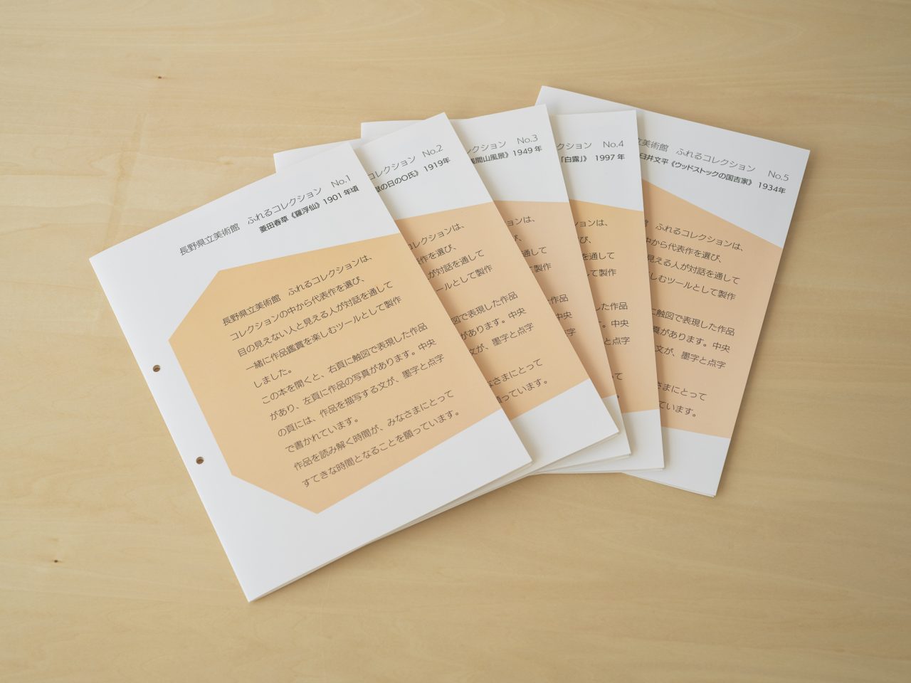 ふれるコレクション: 長野県立美術館のコレクションの5作品を、目の見えない人と見える人が一緒に見るためのブックレット。UV印刷の凹凸で作品が描かれている。